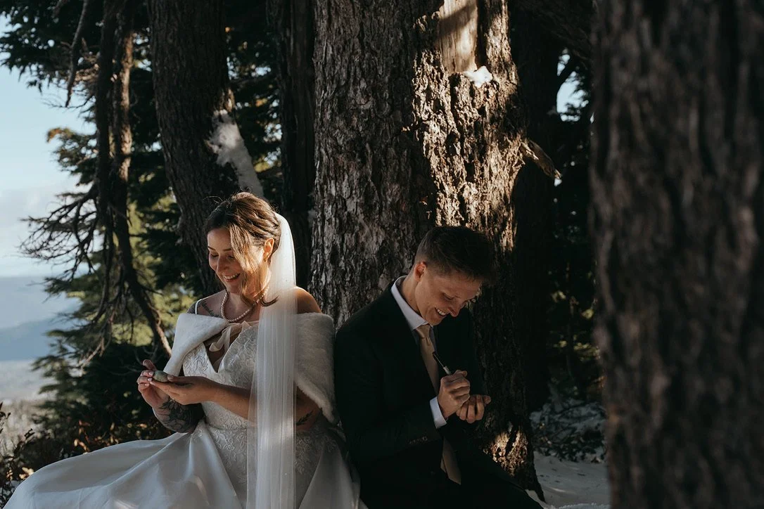 Their photographer, Julia, found a secluded spot in the mountains with Mount Hood standing watch in the distance. We opened the ceremony quietly. Kris and Cole sat back-to-back on a log — so they wouldn't see each other before the first look — and I invited them to write wedding day love notes to the younger versions of the person they were about to marry. We breathed space into that moment. There was no rush.